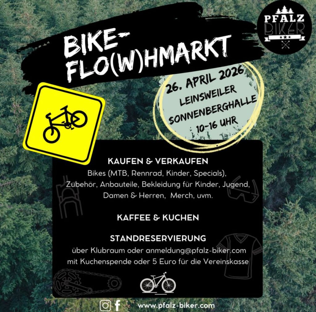 Am 26. April veranstalten die Pfalz-Biker ihren Bike-Flo(w)hMarkt. Wer auf der Suche nach einem neuen gebrauchten Bike ist, sollte sich den Termin vormerken. Auch wer seinen Drahtesel loswerden möchte, hat dort die Gelegenheit dazu. Für mehr Infos bitte den Beitrag öffnen.